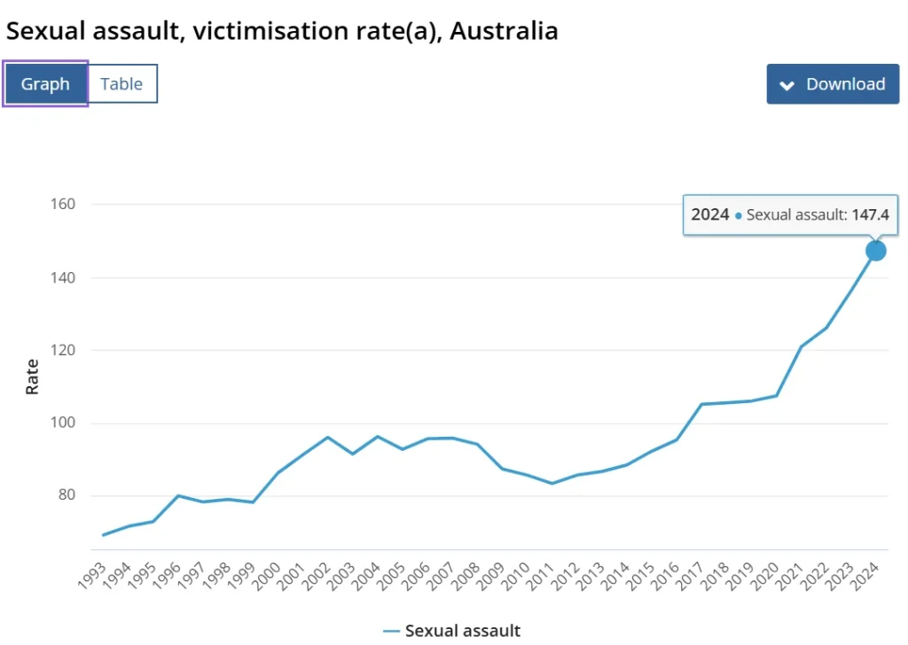 ABS data for 2024 shows almost 10,000 Queenslanders were victims of sexual assault, an 11 per cent rise from the year before. Assault cases also rose by more than 3,000, marking a second straight year of increase.