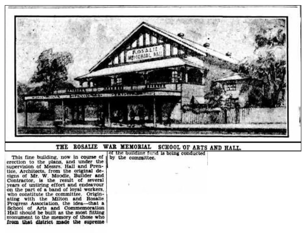 When the hall opened in 1928 as the Rosalie School of Arts Commemoration Hall, it carried a dual purpose. It was both a centre for learning and social life, and a war memorial — reflecting the profound impact of World War One on Australian communities.